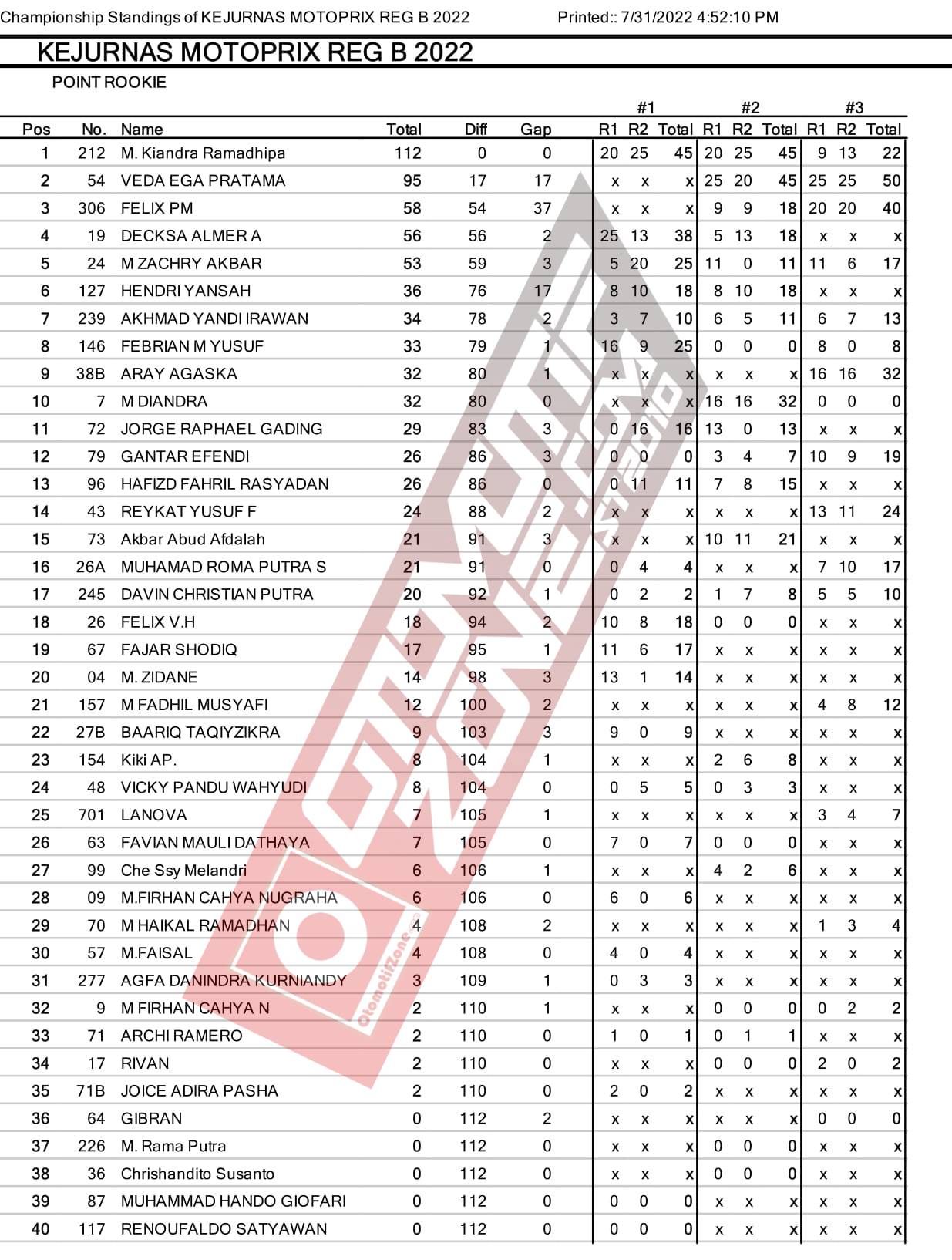 Untuk saat ini Rama dan Veda memiliki selisih point 17 point. Lalu apakah Rama bisa mempertahankan posisinya saat ini sampai akhir seri? Kita tunggu saja kabar beritanya hanya di OtomotifZone.com. Dan berikut standing point sementara Kejurnas Motoprix Region B: