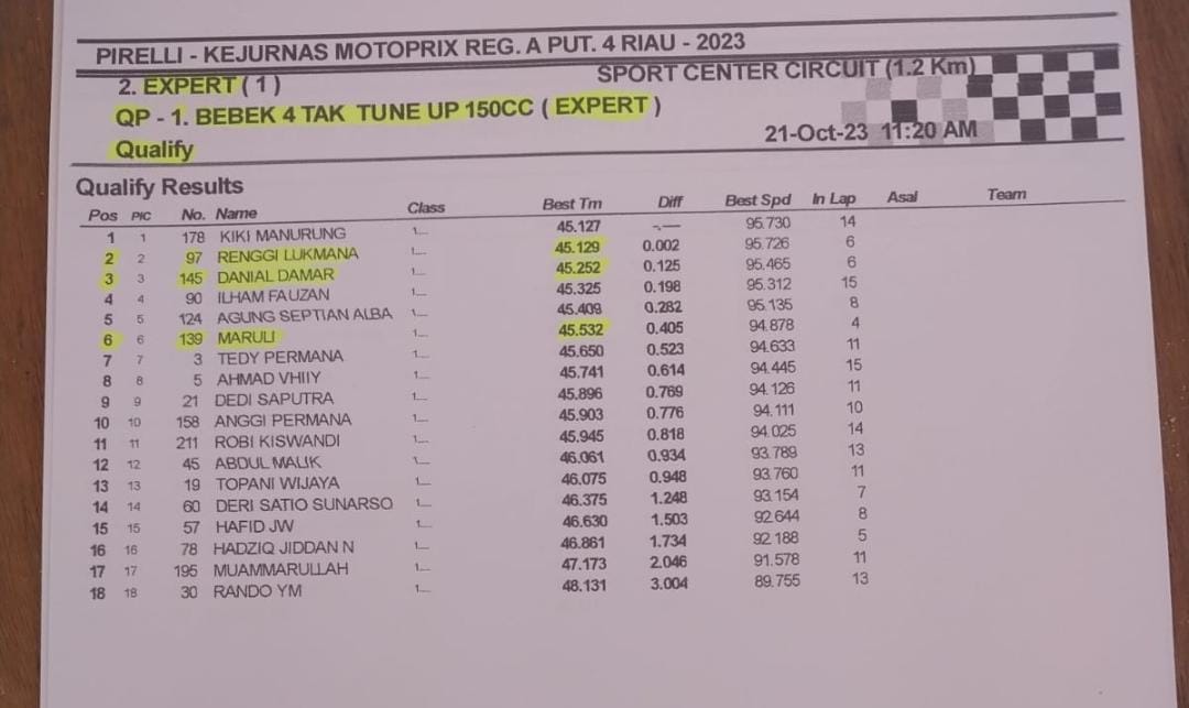 OtomotifZone.com – Bangkinang. Pertandingan yang luar biasa pada Kejuaraan Nasional Motoprix Region A putaran 3 yang berlangsung (21-22/10/23) di Sirkuit Sport Center Bangkinang, Riau. Pertarungan panas terjadi sejak latihan resmi. Terlebih saat babak kualifikasi pada kelas Expert. Para pebalap saling baku hantam catatan waktu untuk merebutkan posisi terbaiknya saat start nanti. Kiki Sudarman Manurung mampu menjadi yang tercepat dan catatan waktu sangat rapat.