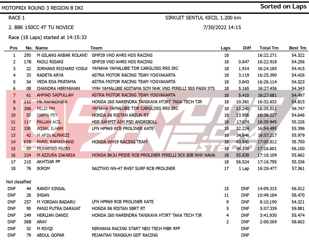 Dua pebalap ini tampil luar biasa juga pada race. Fadli yang finish di posisi kedua mencatatkan waktu best time 54.256 meskipun berada di posisi kedua. Kuda pacu garapan Hawadis menjadi sorotan terutama di Novice. Lalu apakah keduanya akan kembali Berjaya pada race 2? Kita tunggu saja kabar beritanya hanya di OtomotifZone.com