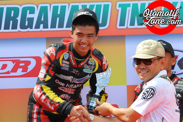 Otomotifzone.com – Padang. Pembalap 7 Berlian Bethar CLD IRC NHK Sederhana Racing Team, Ananda Mugti Tunjukan Kualitasnya di kelas MP5 Kejurnas Motoprix Padang 2017 yang berlangsung di sirkuit Sutan Syahrir, Tabing,Padang, Minggu (8/10). Ia menjadi juara setelah tampil memukau dan lebih gilanya lagi tampil di hadapan publik sendiri membuatnya lebih enjoy.