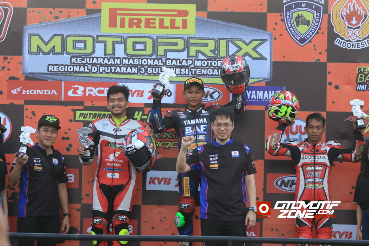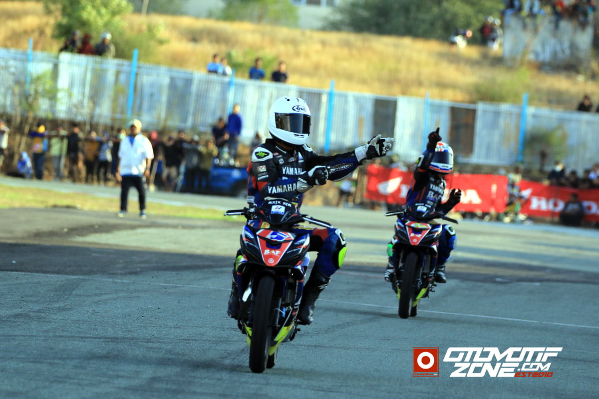 OtomotifZone.com-Palu. Team Yamaha Akai Jaya hari Sabtu ini berpesta dirumah sendiri, waaah ada yang sunatan..??? bukanlah genk, tapi 2 pembalap andalannya meraih podium tertinggi di 2 kelas kejurnas, keduanya diraih M Ilham Elsan Efendi dikelas Rookie dan Herman Bas bersenandung merdu dikelas Expert.
