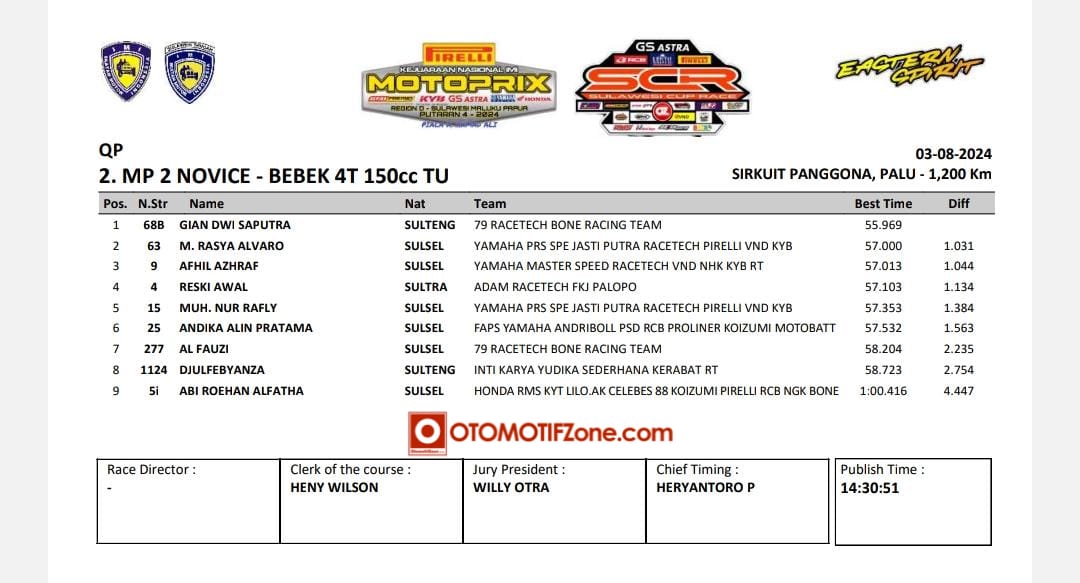OtomotifZone.com – Palu. Kejurnas Motoprix Region D putaran 4 yang berlangsung (3-4/8/24) di Sirkuit Panggona Palu, Sulawesi Tengah. Waktu mencengangkan terjadi pada sesi kualifikasi Novice. Gian Dwi Saputra mampu meraih waktu yang fantastis. Ini membuat dirinya berhasil menjadi yang tercepat pertama.