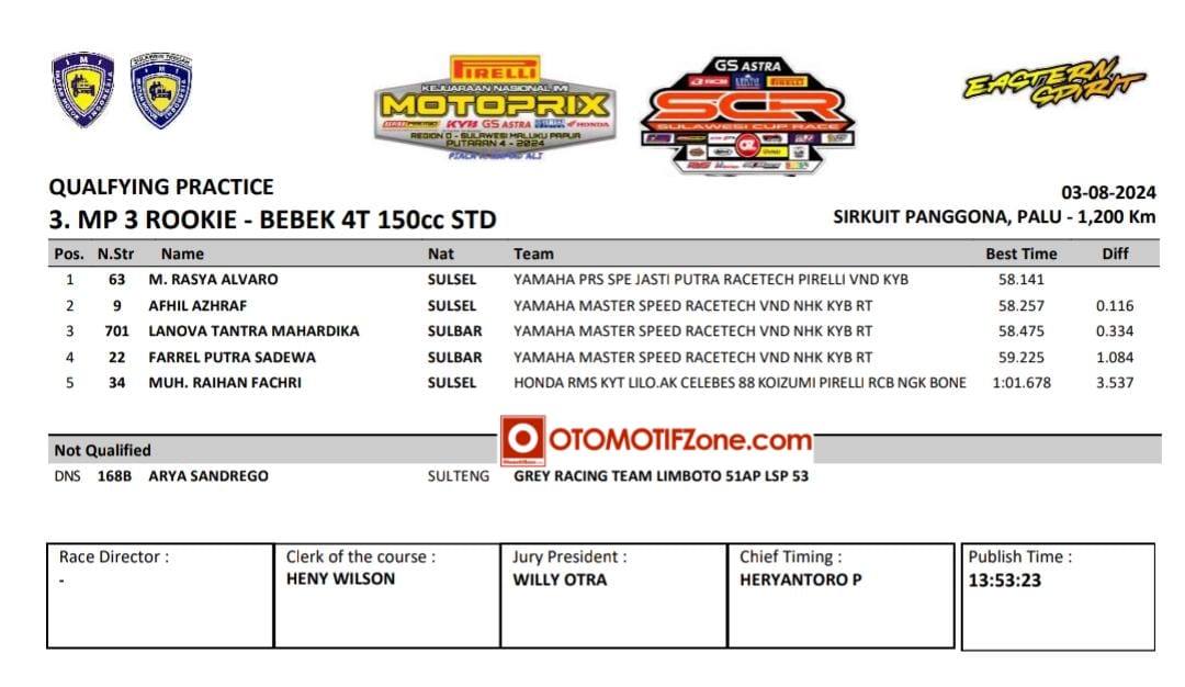Tapi Rasya tidak bisa menganggap remeh lawan. Karena Afhil Azhraf dari tim Master Speed mengintai diposisi kedua. Selisih waktu yang ditorehkan sangat tipis. Jadi M. Rasya tidak bisa santai begitu saja. Lalu berapa posisis pebalap andalan kalian? Berikut hasil kualifikasinya: