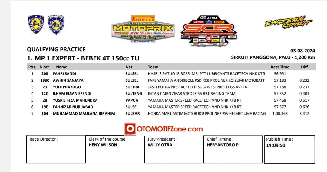 OtomotifZone.com – Palu. Gelaran Kejurnas Motoprix Region D putaran 4 yang berlangsung (3-4/8/24) di Sirkuit Panggona Palu, Sulawesi Tengah. Pertarungan sengit tersaji pada babak kualifikasi Expert. Kuda pacu Hasbi Sipatuo yang ditunggangi oleh Fahri Sandi terlalu perkasa. Sampai bendera finish dikibarkan, Fahri Sandi tetap menjadi yang tercepat dibabak kualifikasi. Ini mambuat pebalap dnegan nomor start 208 akan start pada posisi pertama.