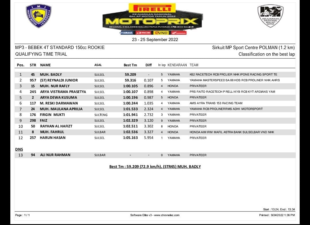 OtomotifZone.com – Polman. Perkembangan makin maju, pebalap muda makin kencang. Ini yang terjadi pada Muh. Badly. Pebalap muda berprestasi ini mencatatkan waktu tercepat di kualifikasi. Dan waktu yang diraih membuat orang melongo.