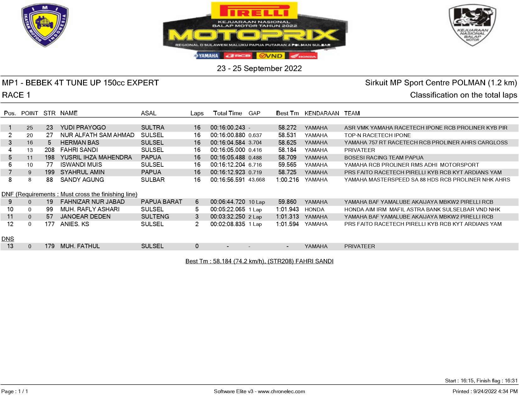OtomotifZone.com – Polman. Perebutan juara 1 race 1 Expert memang sangat sengit. Yudi kembali berulah bersama ASR di Kejurnas Motoprix Region D (23-25/9/22) di Sirkuit MP Sport Center Polman, Sulawesi. Dengan menangnya Yudi pada race 1 ini, membuat persaingan untuk juara region makin sengit. Ko bisa?