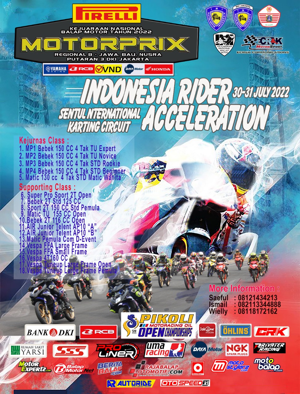 OtomotifZone.com – Jakarta. Gelaran Kejurnas Motoprix Region B akan menjalankan putaran 3 (30-31/7/22) di Sirkuit Internasional Karting Sentul, Bogor. Pada gelaran ini ada 18 kelas yang diperlombakan. Lima kelas Kejurnas dan 13 kelas supporting class.