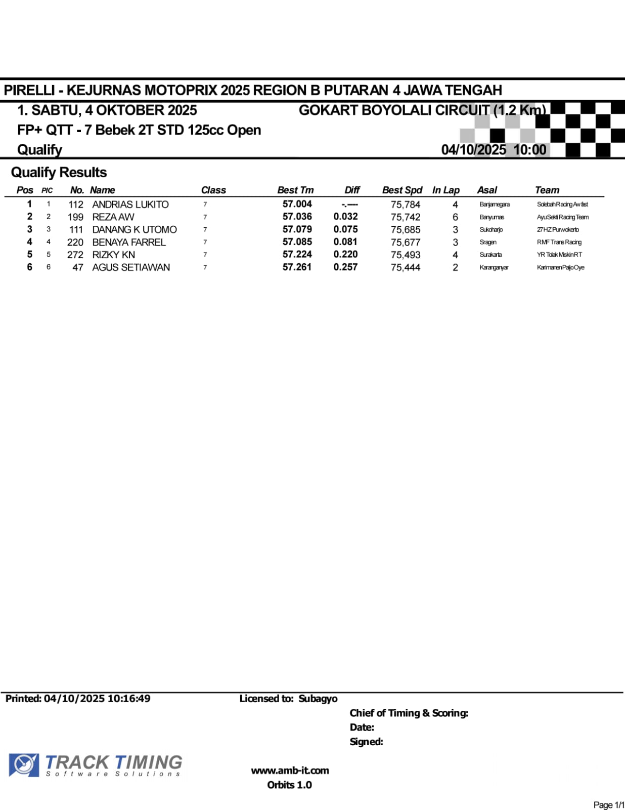 Boyolali – Gelaran Kejuaraan Nasional Motoprix 2025 Region B Putaran 4 Jawa Tengah yang berlangsung di Sirkuit Gokart Boyolali, pada Sabtu, 4 Oktober 2025, menghadirkan persaingan ketat di kelas Bebek 2T STD 125cc Open.