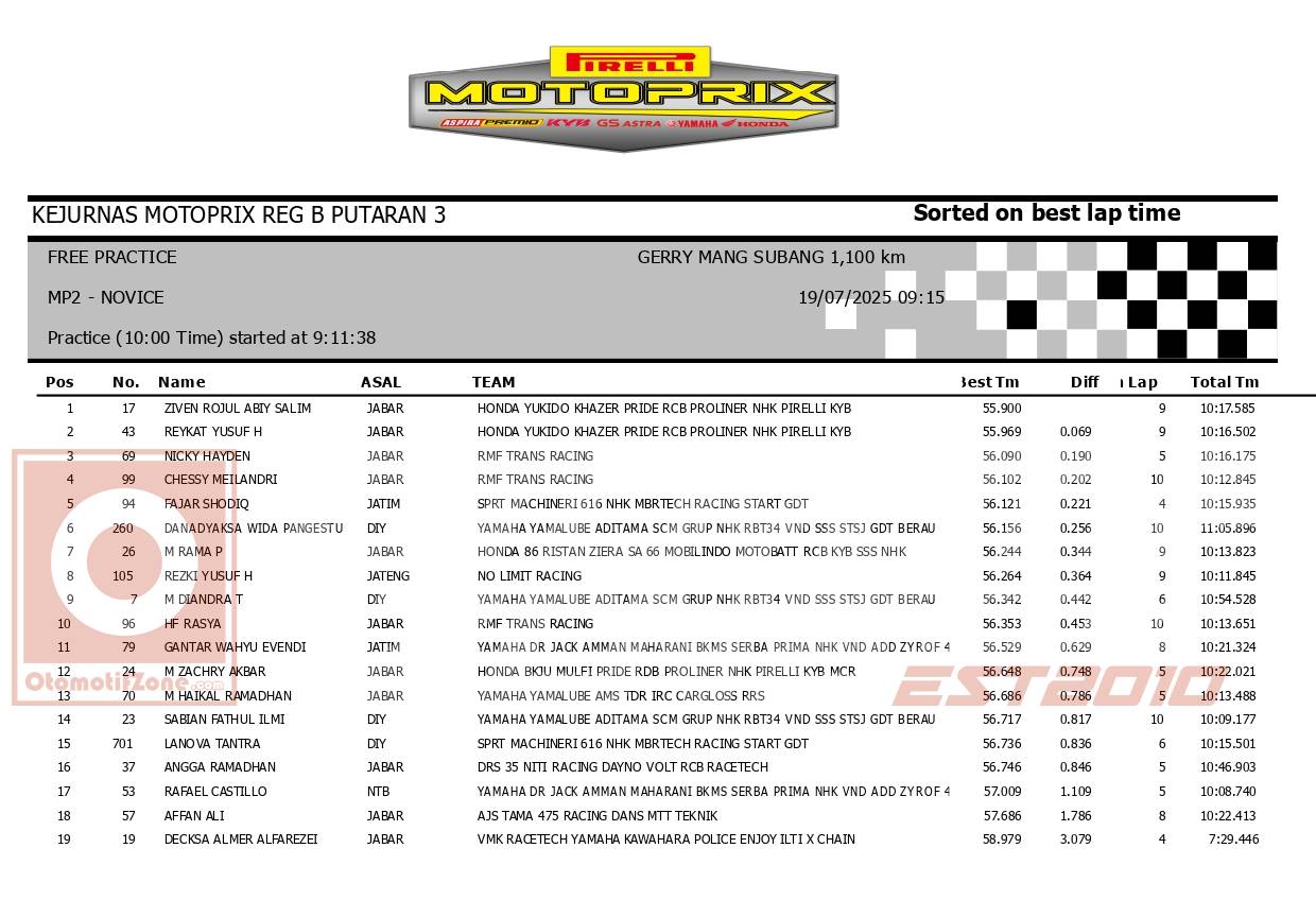 OtomotifZone.com – Subang. Kelas Novice Kejurnas Motoprix Region B Putaran 3 yang digelar di Sirkuit Gery Mang Subang, Jawa Barat (19-20 Juli 2025) langsung menyajikan tensi tinggi sejak sesi Free Practice (FP). Di antara deretan pebalap muda potensial, duet Yukido Racing Team, yakni Ziven Rozul dan Reykat Yusuf, berhasil mengunci posisi terdepan.