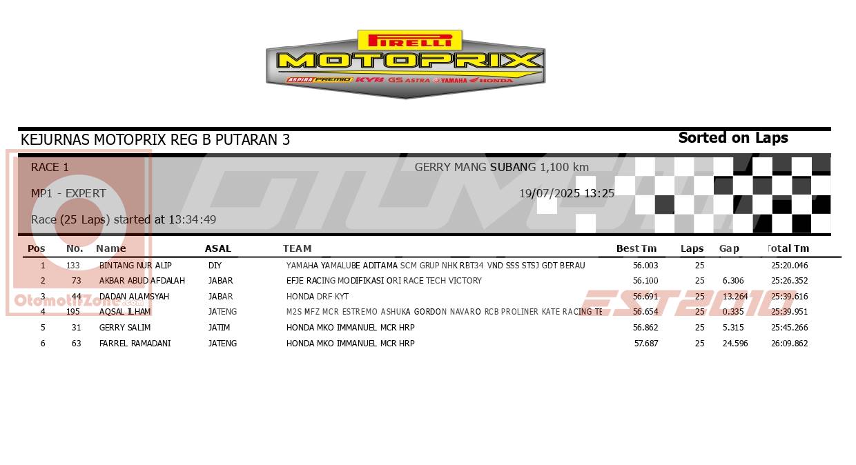 OtomotifZone.com – Subang. Penampilan impresif ditunjukkan Bintang Nur Halif di Race 1 kelas Expert Kejurnas Motoprix Region B putaran 3 yang digelar Jumat (19/7) di Sirkuit Gery Mang, Subang, Jawa Barat. Pebalap dari tim Yamaha Yamalube ADITAMA SCM GRUP NHK RBT34 VND SSS STSJ GDT BERAU tampil dominan sejak lap pertama dan meninggalkan lawan-lawannya dengan jarak yang cukup jauh.