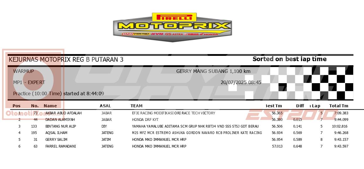 OtomotifZone.com – SubangAkbar Abud tampil menggigit di awal hari kedua Kejurnas Motoprix Region B putaran 3, Sabtu pagi (20/7), di Sirkuit Gery Mang Subang. Pebalap asal Jawa Barat itu mencatatkan waktu tercepat di sesi Warm Up, seolah menjadi jawaban atas penampilannya yang kurang maksimal di hari sebelumnya.