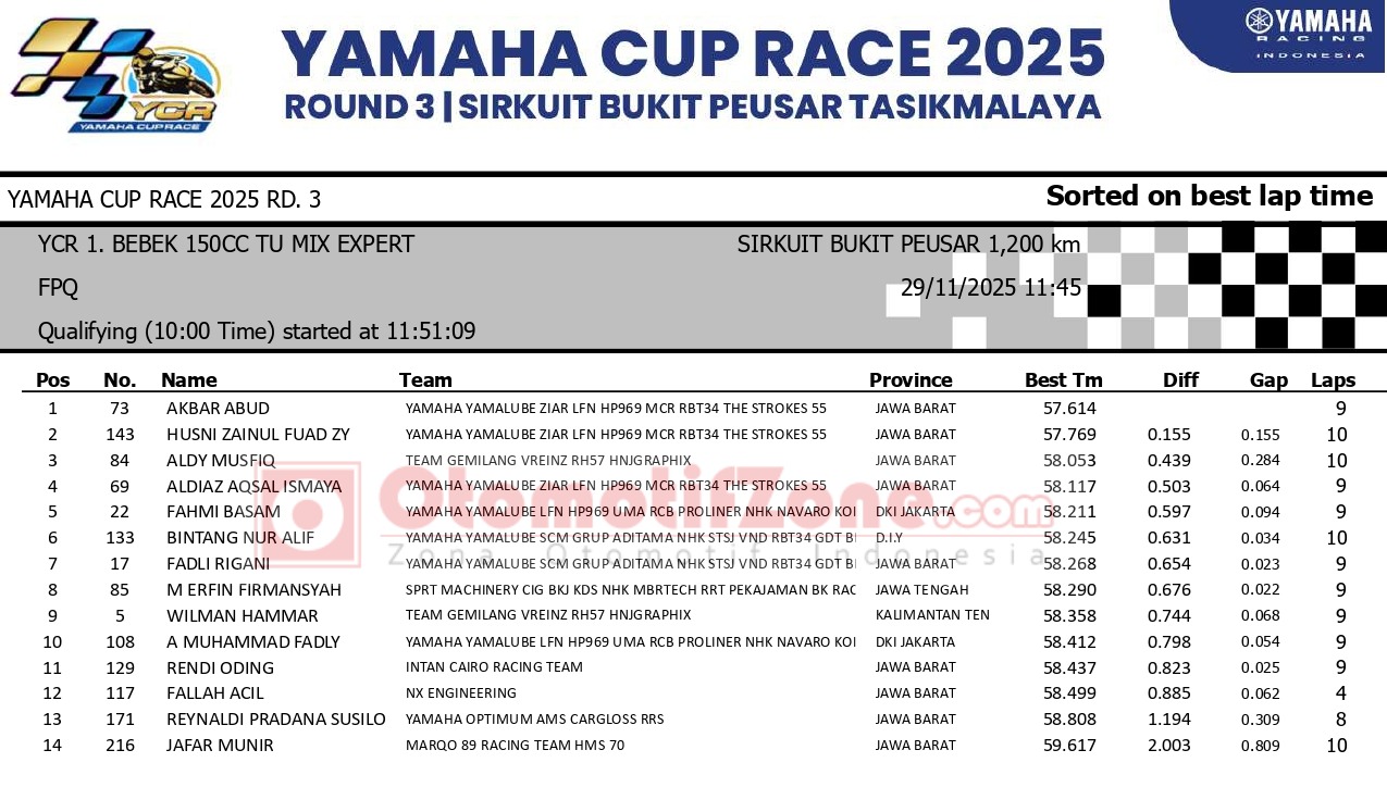 OtomotifZone.com – Tasikmalaya, Bergabung bersama YAMAHA YAMALUBE ZIEAR LFN HP969 MCR RBT34 THE STROKES 55, pebalap muda Jawa Barat Akbar Abud Afdalah langsung menunjukkan kualitasnya. Pada gelaran Yamaha Cup Race (YCR) Seri 3 yang berlangsung pada 29–30 November di Sirkuit Bukit Peusar, Tasikmalaya, Abud sukses menjadi yang tercepat di kelas Bebek 4T 150 TU Expert (YCR1).