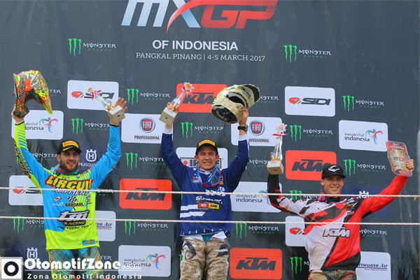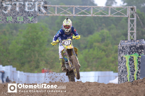 Otomotifzone.com – Pangkalpinang. Pembalap Suzuki Factory Jeremy Seewer berhasil menjadi juara setelah bertarung habis – habisan dikelas MX2 pada gelaran akbar MXGP Indonesia 2017 yang berlangsung di Sirkuit Gor Sahabudin, Pangkalpinang, Indonesia. Minggu (5/3). terlebih lagi permukaan sirkuit begitu berlumpur sehingga menyulitkan para pembalap, tapi berkat ketenangan serta kerja sama tim antara dirinya dengan manajer tim Stefan Everts semakin membuat Seewer nyaman leading diurutan pertama.