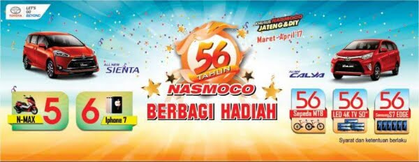 Belum hadiah menarik untuk setiap pembelian all produk dari Toyota. 56 Tahun Nasmoco siapkan hadiah besar berupa 1 All New Sienta, 1 All New Calya, 5 Yamaha N-Max, 6 Iphone7, 56 Sepeda MTB, 56 LED 4K TV 50″, 56 Samsung S7 Edge yang akan diundi pada 15 April 2017 nanti.
