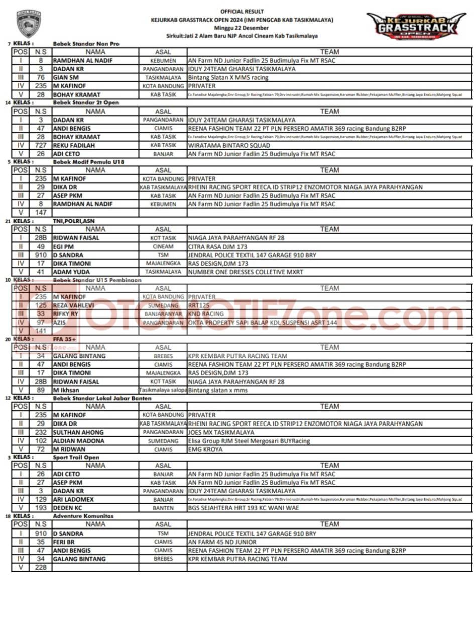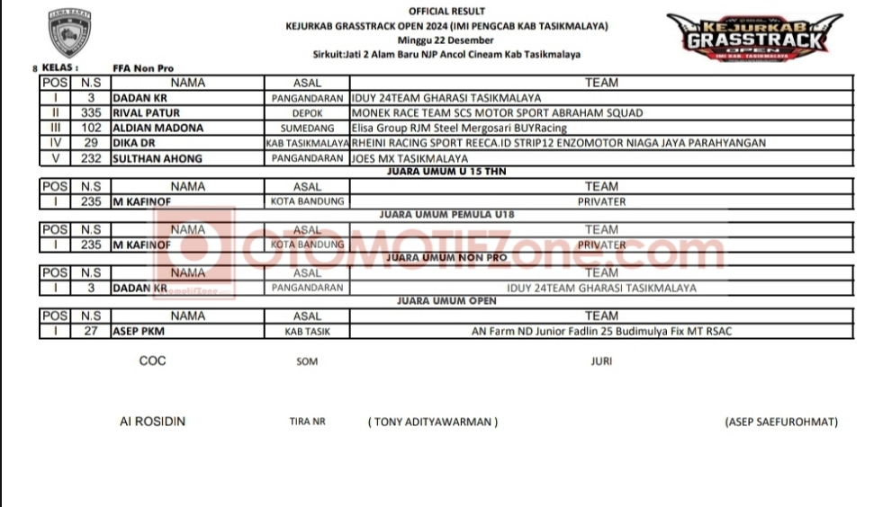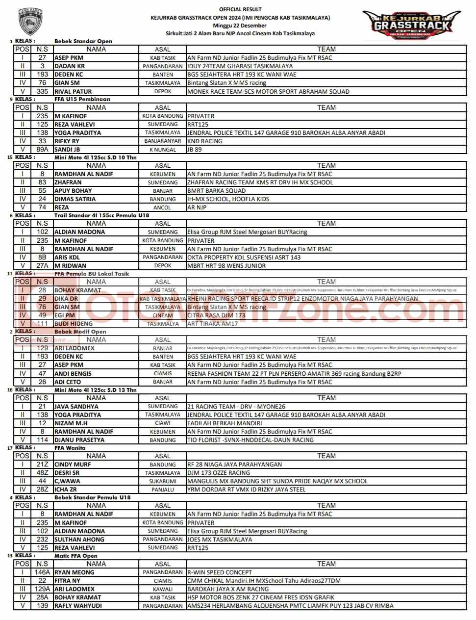 OtomotifZone.Com – Tasikmalaya. Gelaran balap garuk tanah bertitel Kejurkab Grasstrack Open IMI Kabupaten Tasikmalaya yang berlangsung 1 hari sukses digelar. Event berlangsung di Sirkuit Jati 2 Alam Baru NJP Ancol Cineam Kabupaten Tasikmalaya Jawa Barat, Minggu (22/12/2024). Berikut hasil resminya: