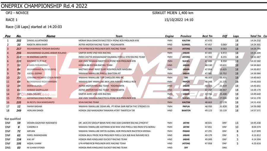 Lalu apakah Dimas bisa meraih gelar juara lagi pada race 2 nanti? Kita tunggu kabar berita selanjutnya hanya di OtomotifZone. Dan berikut hasil race 1 Novice: