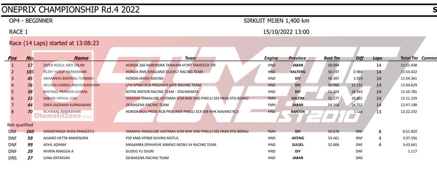 Strategi ini ternyata berhasil dilancarkan. Terbukti Ziven mampu tampil apik dan mengibarkan bendera Narendra dipanggung tertinggi. Sekali lagi selamat untuk Ziven Rozul. Kira kira apakah Ziven bisa menjadi jaura di race 2 besok? Kita tunggu saja kabar beritanya hanya di OtomotifZone.com. Dan berikut hasil lombanya: