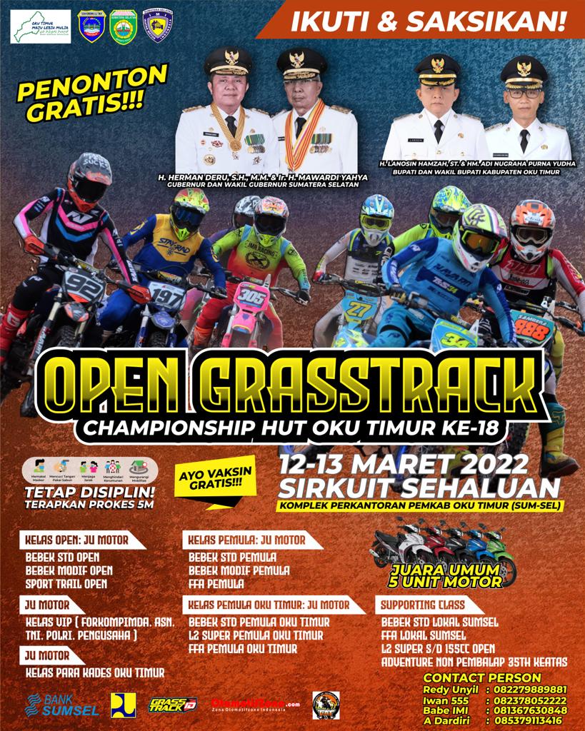 OtomotifZone.com – Palembang. Akhir pekan ini akan diselenggarakan Open Grasstrack Championship Oku Timur ke18 (12-13/3/22) di Sirkuit Sehaluan , Komplek Perkantoran Pemkab Oku Timur, Sumatera Selatan. Pada gelaran ini panitia penyelenggara sudah menyiapkan hadiah berlimpah. Termasuk lima unit motor yang akan diberikan kepada Juara Umum disetiap katagorinya.