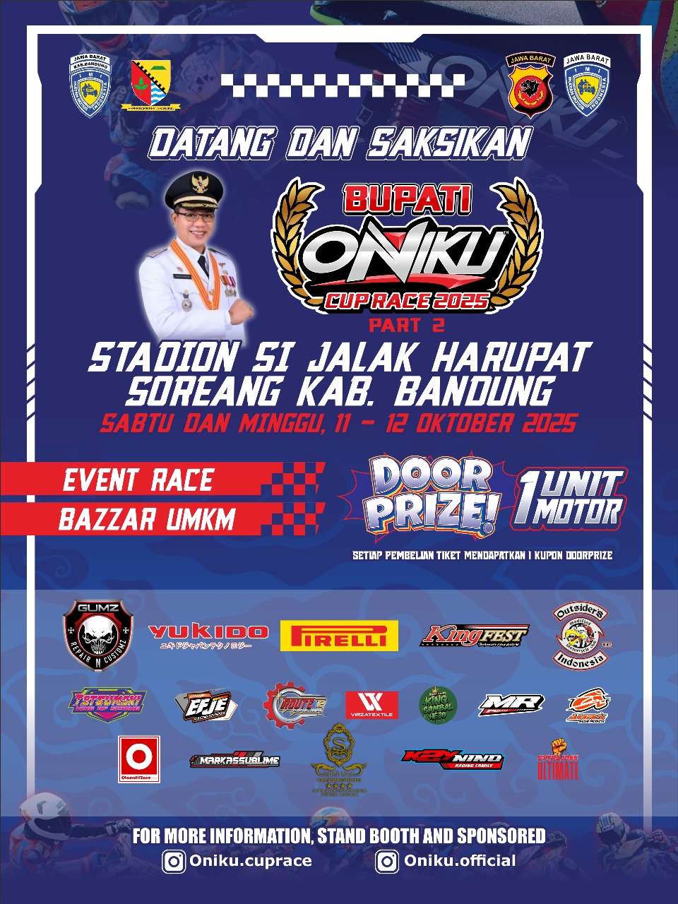 OtomotifZone.com – Bandung. Gelaran balap motor bergengsi Bupati Oniku Cup Race 2025 Part 2 siap mengguncang Stadion Si Jalak Harupat, Soreang – Kabupaten Bandung, pada Sabtu dan Minggu, 11–12 Oktober 2025. Event spektakuler ini dipersembahkan oleh Pemerintah Kabupaten Bandung bersama IMI Jawa Barat, menghadirkan kombinasi antara balap motor, bazar UMKM, dan doorprize satu unit motor untuk para penonton yang membeli tiket.