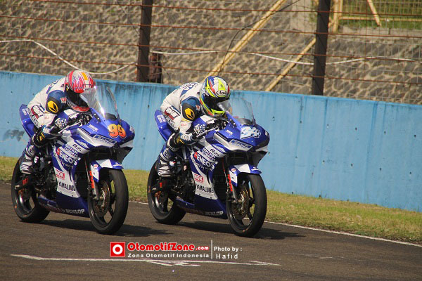 Otomotifzone.com-Sentul, Bogor. Walaupun hasil kualfikasi Kelas Asia Production 250cc di kuasai Apiwat Wongthananon dan Takehiro Yamamoto. Tumpuan pasukan Yamaha Indonesia di kelas baru 250cc di Asia Road Racing Championship ini terlihat ada perkembangan. “Performancenya udah bagus mas, udah ada improve dari seri 1 kemarin.” ungkap Galang Hendra yang terlihat enjoy dengan motornya sekarang. Paling berat jelas jawara jepang Take11..Tapi setidaknya feeling kamu bisa merengsek ke depan kan besok? “Yaitu mas, lawan dari Jepang hebat-hebat. Kalo aku yakin bisa mas,” yakin Galang. Walaupun rekan setim Galang seperti Imanuel Pratna sama kekuatannya dan absennya Sigit PD karena cidera yang di derita saat seri 1 Sepang kemarin. Kekuatan Yamaha yang lain seperti M. Zaky, Rusman Fadhil, Wilman Hammar dan team lainnya penunggang Yamaha sepertinya tidak akan tinggal diam. Gatal ingin ikuti sengitnya pertarungan Asia Production 250cc. Tunggu besuk!