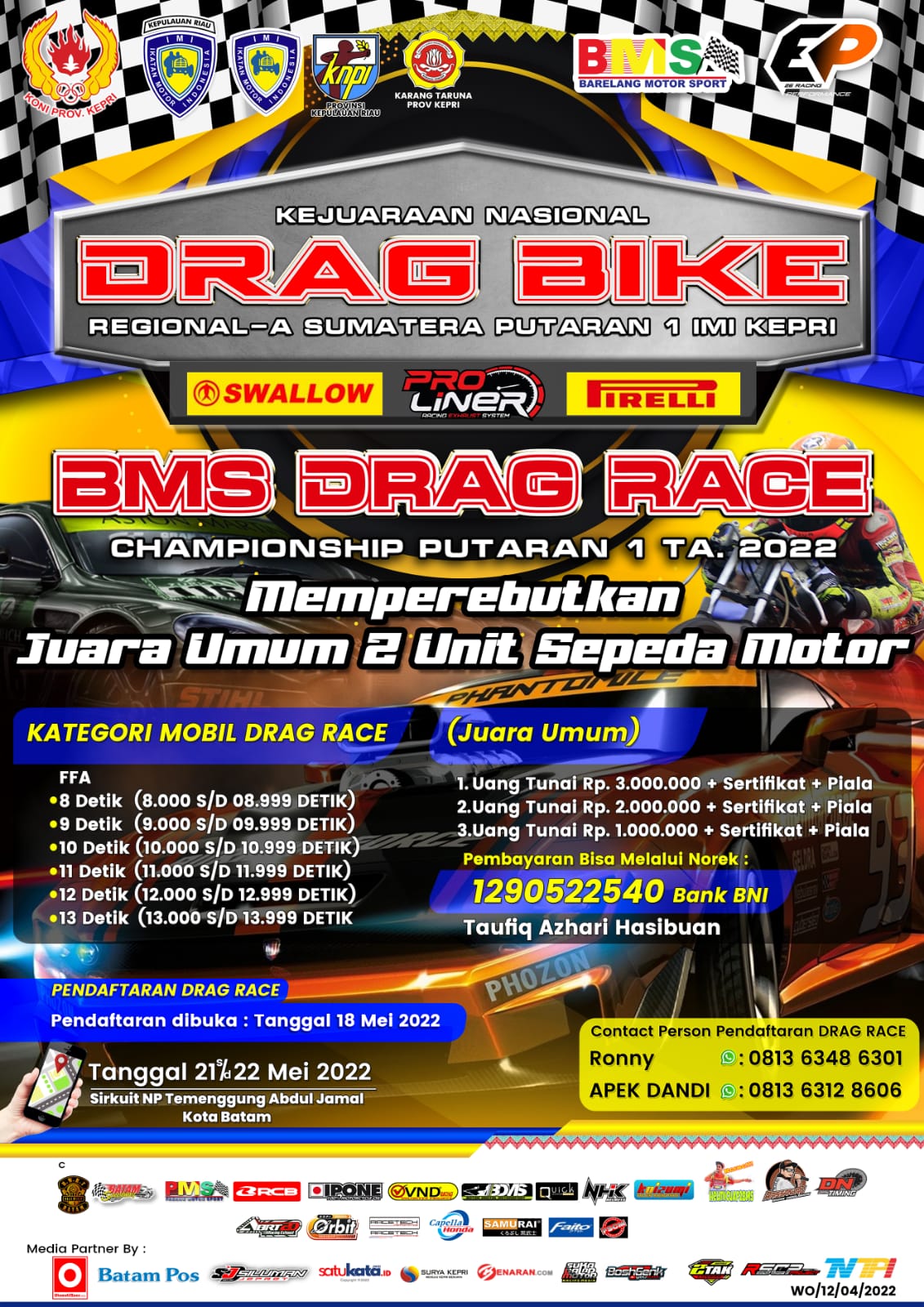 OtomotifZone.com – Kepri. Memang tidak pernah ketinggalan kalau bicara kebangetan pasukan BMS adakan event. Klub yang dipimpin oleh H. Willy Octra selaku ketua sungguh luar biasa kalau garap event. Seperti event BMS Drag Race yang akan berlangsung ( 21-22/5/22) di Sirkuit NP Temenggung Abdul Jamal, Kota Batam. Mereka akan memberi konsep yang luar biasa pada event ini. Hadiah Juara Umum akan diberikan kepada pebalap pebalap terbaik.