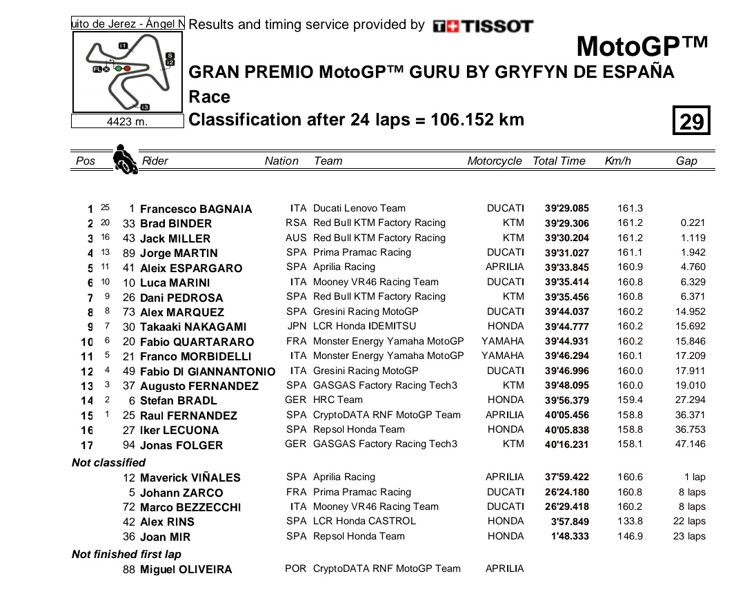 Beberapa lap kemudian Pecco kembali mengambil posisi Jack dengan bersih. Dilanjut satu lap sebelum finish aksi overtake kepada Brad Binder dengan rear wheels stering sliding di tikungan Jorge Lorenzo. Pecco menang dengan perhitungan mapan seri kali ini.
