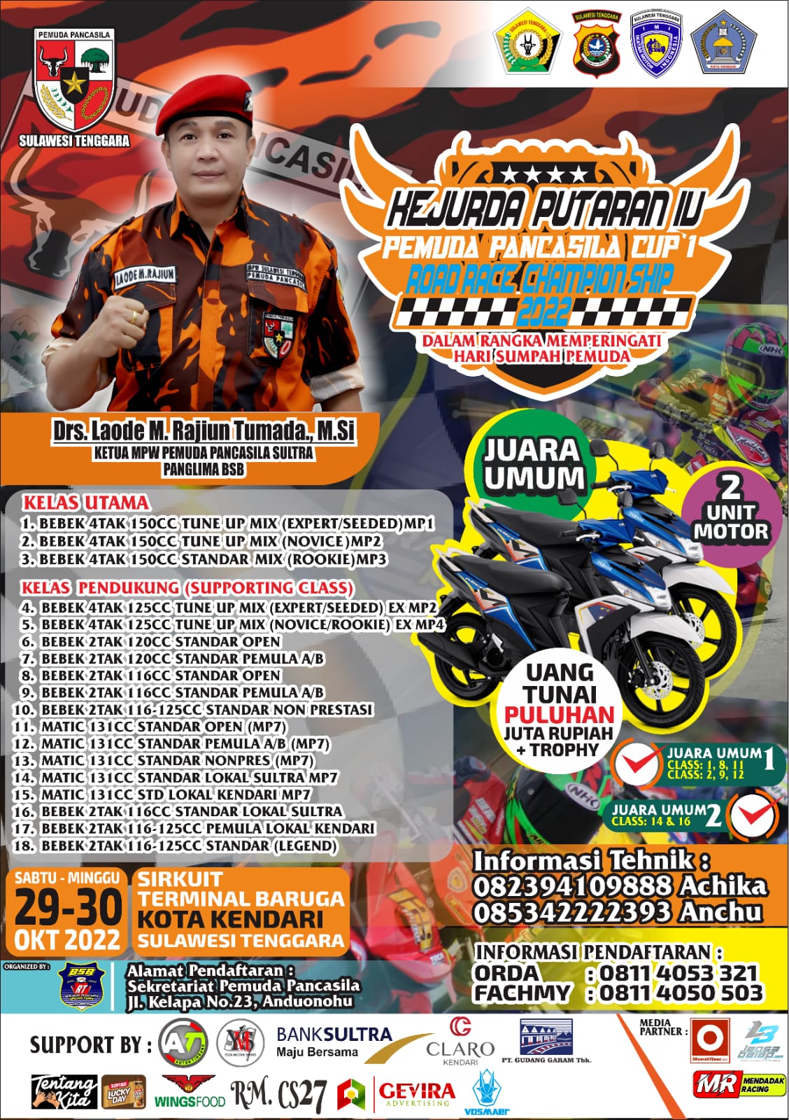 OtomotifZone.com – Kendari. Peringati hari Sumpah Pemuda, Pemuda Pancasila adakan Road Race Championship 2022 dalam gelaran event Kejuaraan Daerah Balap Motor IMI Sulawesi Tenggara Seri ke-4 pada 29-30 Oktober.