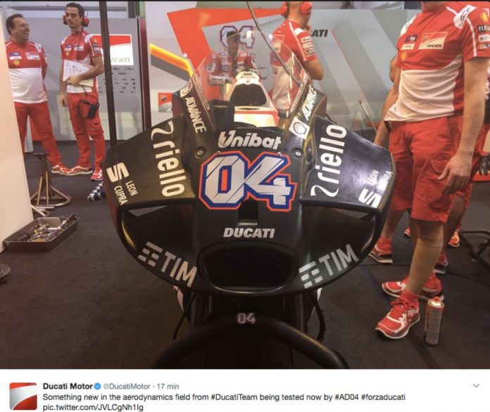 Otomotifzone.com – Losail.Ducati akhirnya memutuskan menggunakan Fairing Prototype baru pada hari kedua test pramusim MotoGP Qatar 2017 yang berlangsung di Sirkuit Losail Qatar, Sabtu (11/3). Memang pada beberapa tahun terakhir Ducati lebih fokus pada pengembangan winglet, tetapi setelah berlakunya peraturan pelarangan winglet di musim 2017 karena faktor keselamatan membuat para Insinyur melakukan beberapa inovasi terbaru untuk mendapatkan stabilitas motor yang setara dengan saat penggunaan winglet seperti perubahan fairing bahkan fairing Ducati mengadopsi F1 Style.