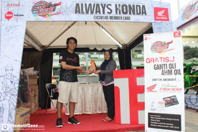 OtomotifZone.com – Bandung. Pada acara Honda Modif Contest (HMC) 2016 di Cikapundung Riverspot, Bandung pada 5-6 Maret 2016 yang diselenggarakan PT Astra Honda Motor (AHM) bekerja sama dengan main dealer Honda di Jawa Barat, PT Daya Adicipta Motora (DAM). Always Honda Exclusive membercard memberikan sensasi bagi pemilik kartu Always Honda dengan membagi-bagikan AHM Oil bagi pengunjung yang dapat menunjukkan Kartu Always Honda.