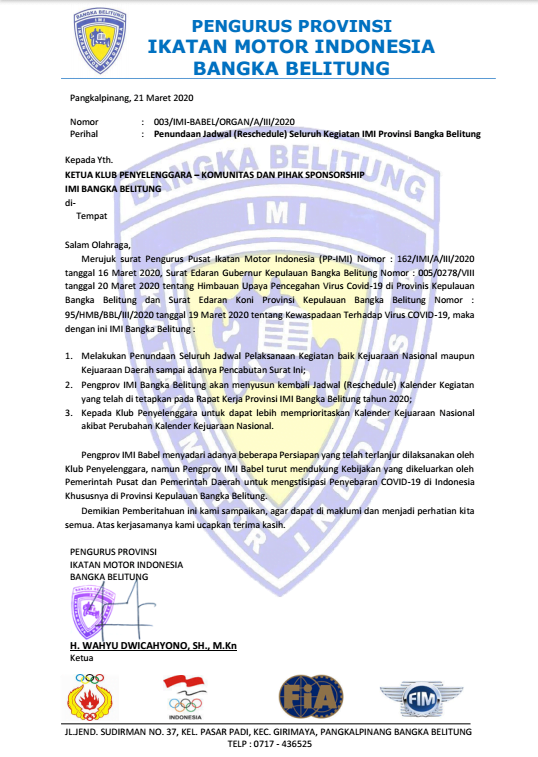 OtomotifZone.com – Bangka-Belitung. Seiring dengan adanya wabah Covid- 19 yang kini sudah menyebar di Indonesia dan berimbas pada beberapa kegiatan otomotif untuk di atur ulang kembali dari jadwal yang telah direncanakan sebelumnya, IMI Provinsi Bangka-Belitung (Babel) pun langsung membuat surat edaran terkait itu semua untuk ditujukan kepada penyelenggara, komunitas dan juga para sponsor.
