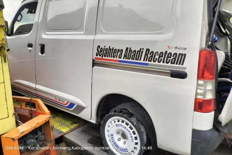 Di dalam mobil tersebut ada 3 orang termasuk pembalap Kencana Dharma. Dalam informasi yang kami terima mobil grand max warna putih tersebut mengalami pecah ban belakang sehingga mobil terguling dan mengalami Ringsek.