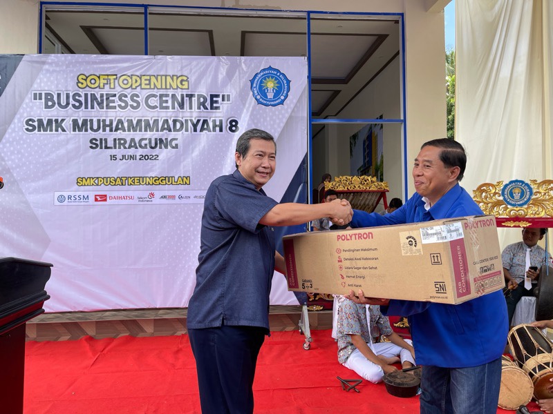 Haryanto juga menyerahkan satu buah air conditioner kepada Muchlas, kepala sekolah SMK Muhammadiyah 8 Siliragung yang nantinya akan digunakan untuk business center.