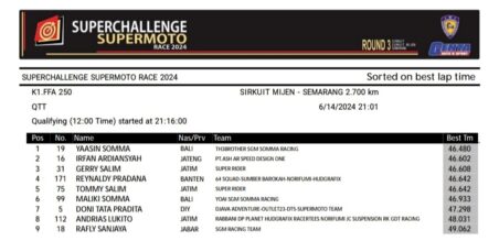 OtomotifZone.com – Semarang. Seri Tasikmalaya kemarin sosok Yaasin Somma membuat gebrakan di kelas FFA 250. Superchallenge Seri 3 Kejurnas Supermoto sirkuit Mijen, Semarang 14 Juni 2024 sesi kualifikasi pada malam ini kembali kelas ini menunjukkan nama Yassin ada di posisi istimewa. Pembalap asal Bali tersebut tampil mantab sebagai yang tercepat.