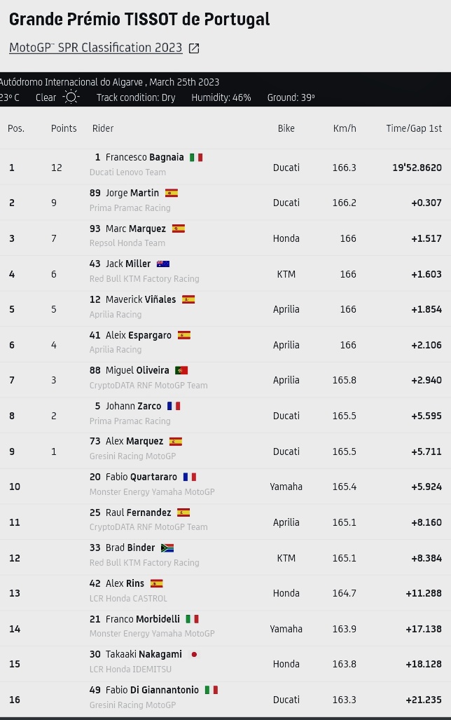 Dua Ducati 2023 berhasil nangkring di podium setelah Jorge Martin mampu mempertahankan posisinya di belakang Pecco. Disusul Marc Marquez yang sabar menunggu keteledoran lawan. Miguel Olivera yang out dari posisi ketiga bagaikan berkah bagi pembalap Repsol Honda tersebut. Berikut hasil racenya.