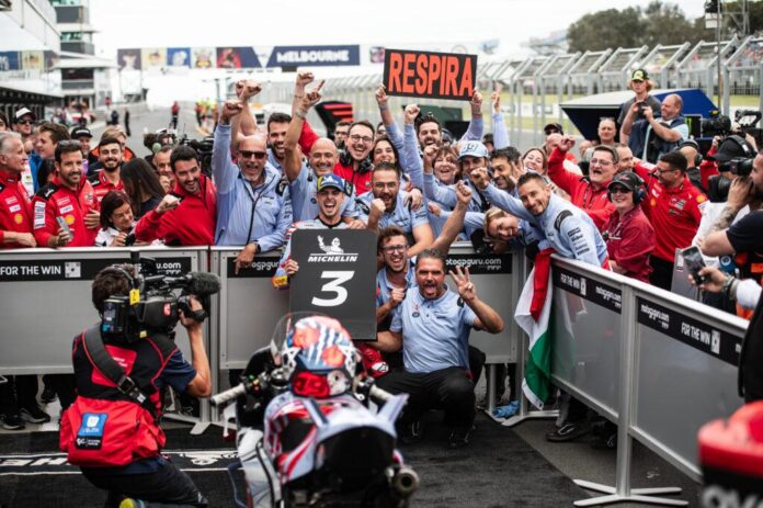 OtomotifZone.com-Australia. Fabio Di Giananntonio akhirnya berhasil naik podium untuk pertama kalinya di Sirkuit Philips Island Sabtu 21 Oktober 2023 lalu. Progress Di Giananntonio terbilang cukup signifikan menjelang seri-seri akhir MotoGP 2023. Di Indonesia kemarin finish keempat dan pada akhirnya di Australia kemarin pembalap kedua Ducati Gresini tersebut mempersembahkan podium meski hanya di urutan ketiga.