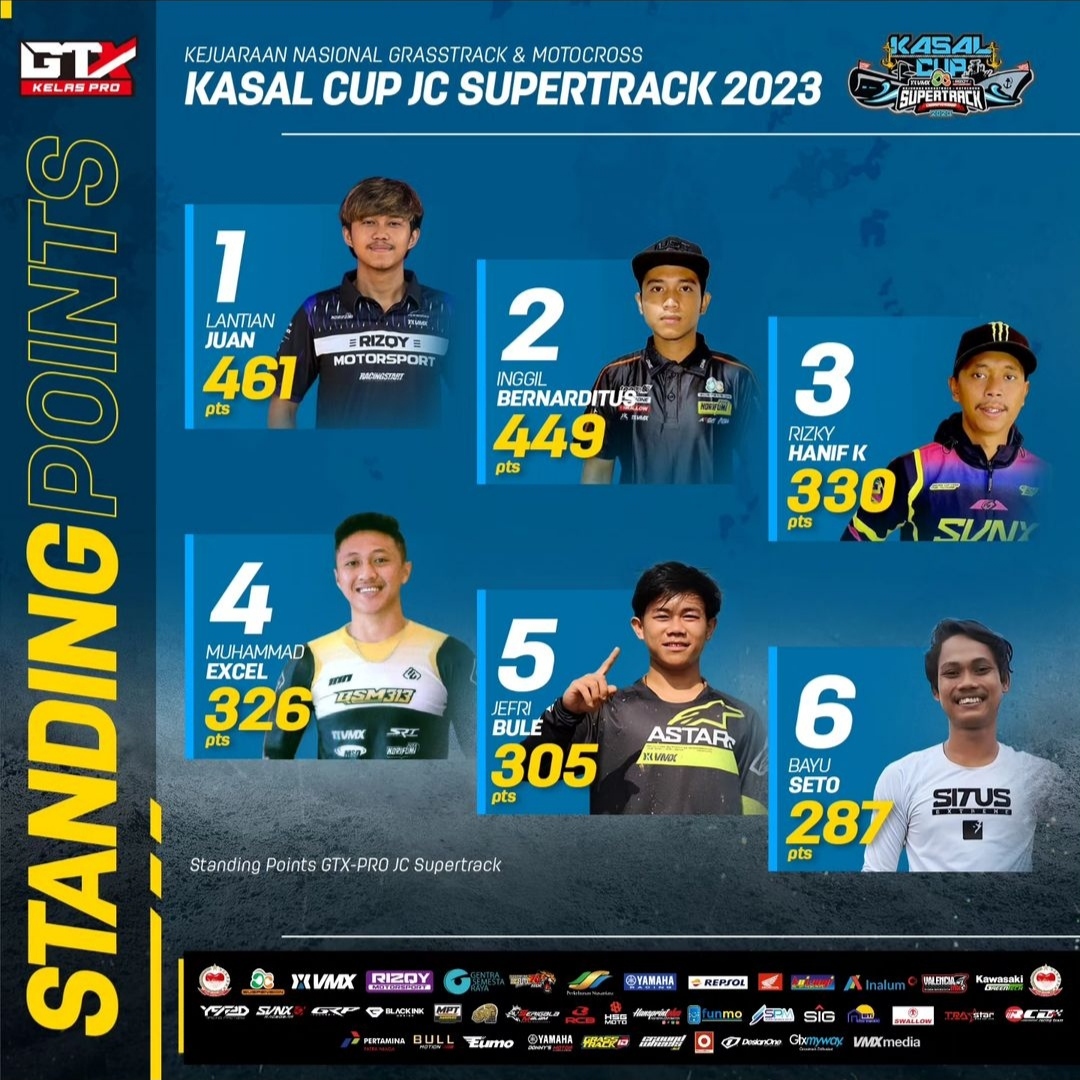 OtomotifZone.com-Deli Serdang. Pada putaran Grand Final Kasal Cup JC Supertrack sirkuit Jaharun Center, Deli Serdang, Sumatera Utara 14-15 Oktober 2023 memantau point kelas GTX Pro mengerucut kepada sosok Lantian Juan dan Inggil Bernaditus. Dua pembalap ini hanya berjarak tipis di klasemen sementara dengan 12 poin.