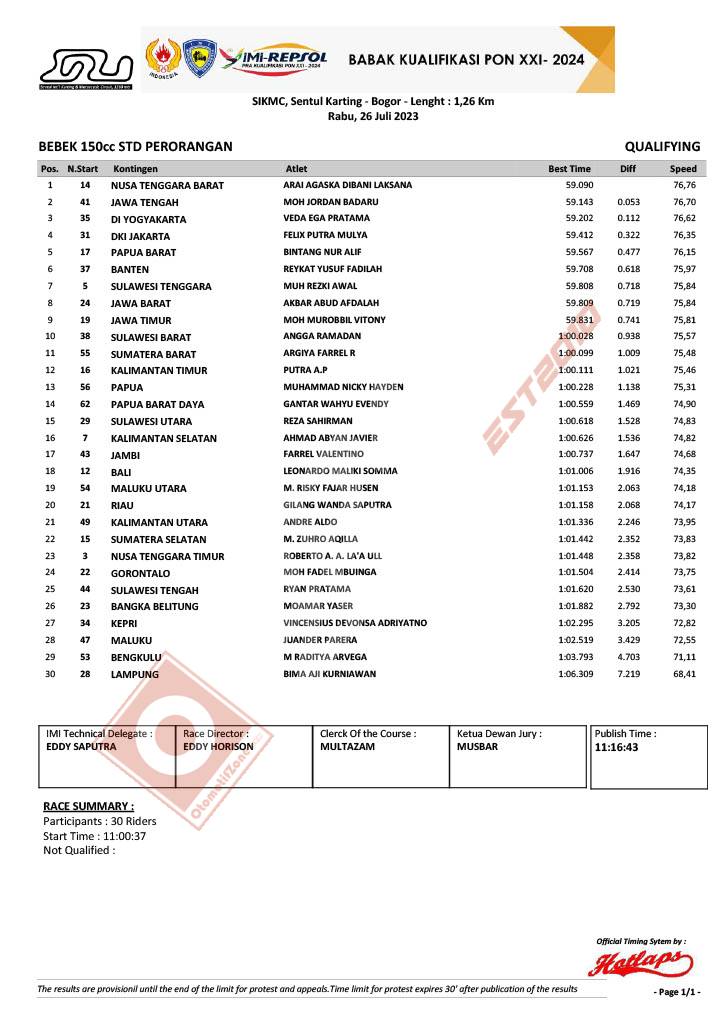 OtomotifZone.com – Bogor. Prestasi yang ditunjukkan oleh Arai dalam ajang QTT STD Perorangan di Pra PON XXI memang sangat mengesankan. Dengan mencatatkan waktu 59.090, Arai berhasil menjadi pebalap tercepat dan meraih posisi start pertama.