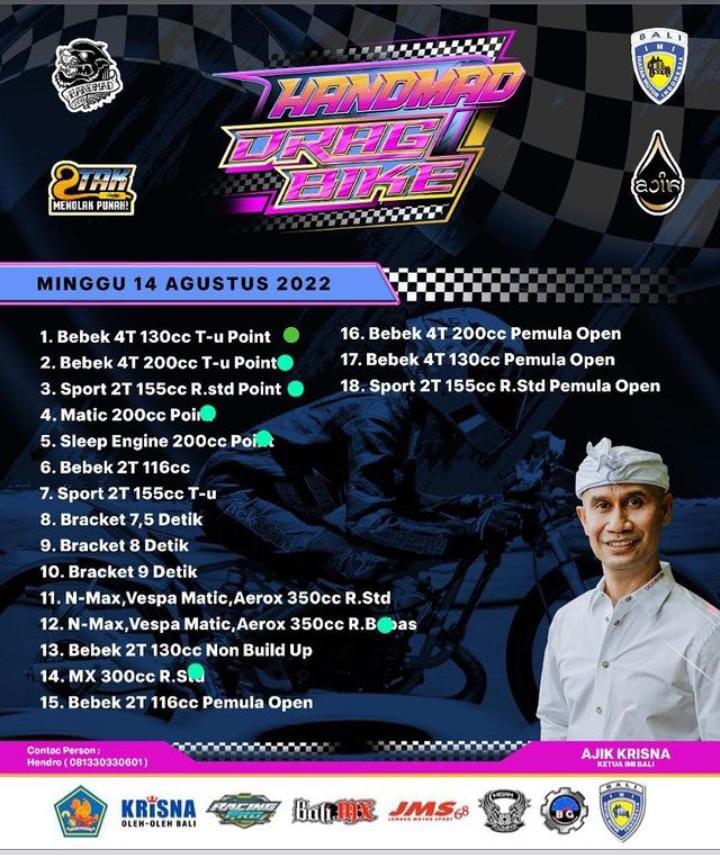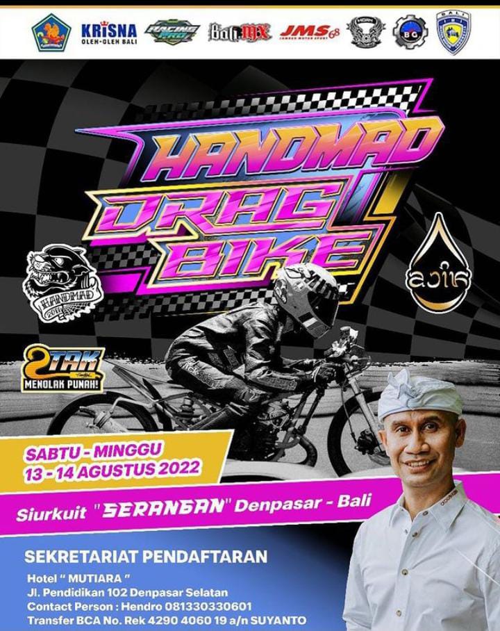 Berlokasi di Sirkuit Serangan, Denpasar – Bali, gelaran dengan tajuk Handmad Drag Bike akan dilangsungkan (13-14/8/2022). Lanjut sebanyak 18 kelas akan dijalankan oleh pihak panitia penyelenggara.