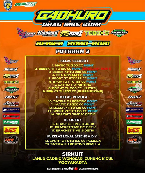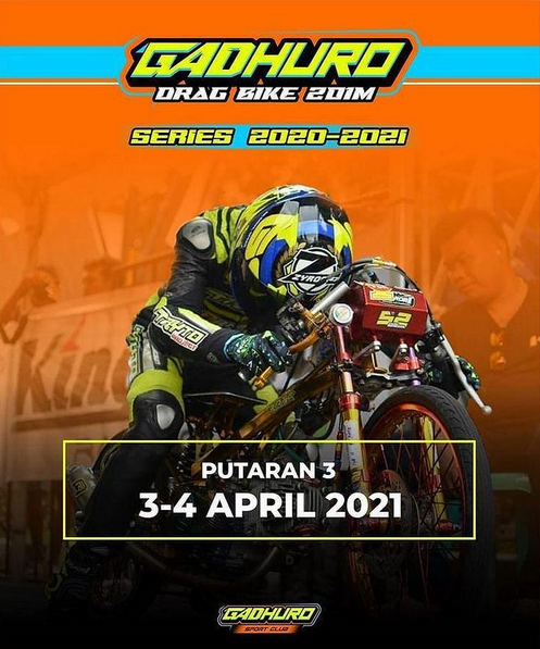 Gadhuro akan menjalankan perlombaan drag bike pada awal pekan depan (3-4/4/2021) bertempat di Sirkuit NP Lanud Gading, Wonosari, Gunung Kidul – Yogyakarta. Sebanyak 4 kategori kelas dalam 19 kelas balapan akan diadu kecepatannya.