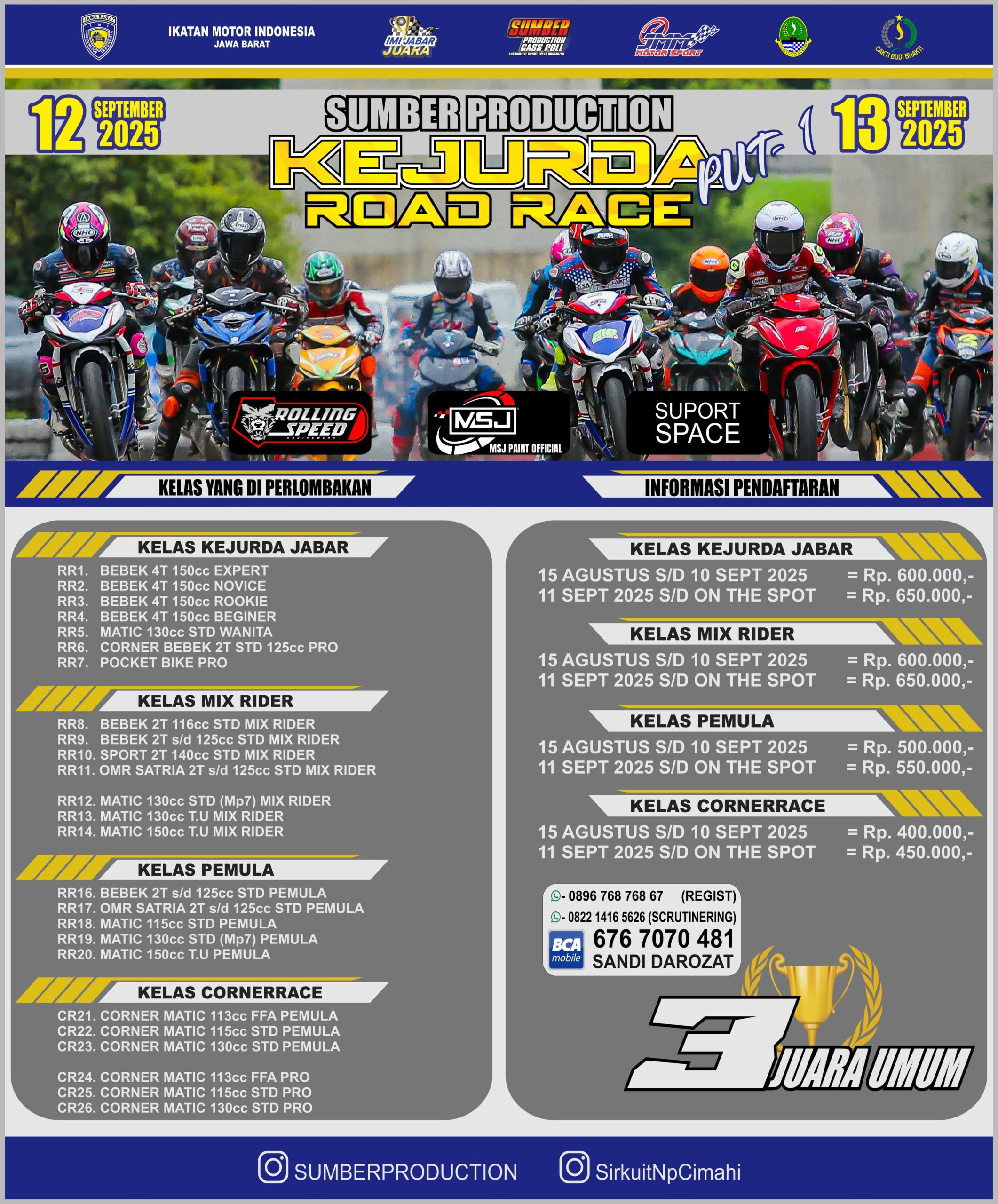 OtomotifZone.com – Bandung. Pecinta balap motor bersiaplah! Ajang Kejurda Road Race 2025 Putaran 1 yang diselenggarakan oleh Sumber Production akan segera berlangsung pada 12-13 September 2025 di Sirkuit NP Brigif Cimahi, Jawa Barat. Event ini merupakan bagian dari kalender resmi Ikatan Motor Indonesia (IMI) Jawa Barat, dan dipastikan akan menjadi ajang pembuktian bagi para pebalap terbaik tanah air.