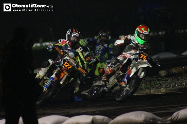 “Soal spek kita sama regulasi IMI untuk Supermoto. Tapi kita full di aspal dan balap tetap sampai malam. Untungnya hanya balap di aspal terlihat malam ini. Kalau lewat tanah terus hujan seperti malam ini kacau kita. Problem kita lampu nggak bisa memutar..” keterangan Tjahyadi Gunawan, owner Genta Auto & Sport malam ini.