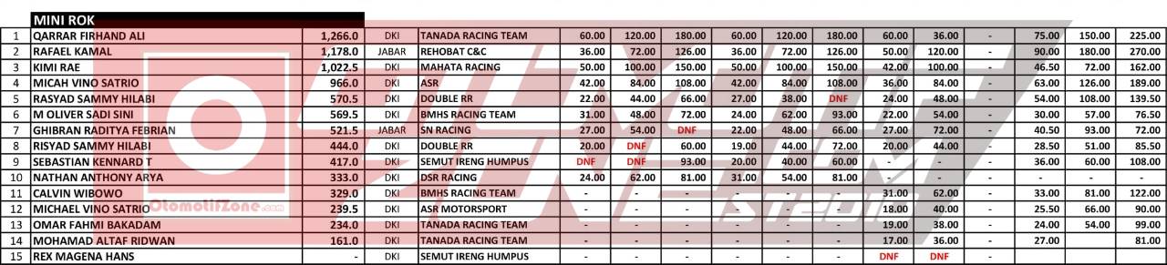 Rafael Kamal, melihat penampilan 2 race sebelumnya memang patut menjadi ancaman, 2 seri awal dengan hasil kurang maksimal, ternyata tidak menyerah dan mulai mengejar ketertinggalaanya dan mampu menyodok diposisi ke 2 setelah berlaga sempurna di 2 seri terakhir, sang cool driver Kimi juga diam-diam menghanyutkan, gaya balap smooth ini tertinggal 243,5 point dari pegokart Tanada racing, namun seri 5 dan 6 dengan point berjenjang sejak heat hingga final, peluang untuk saling kejar point sangat terbuka lebar.