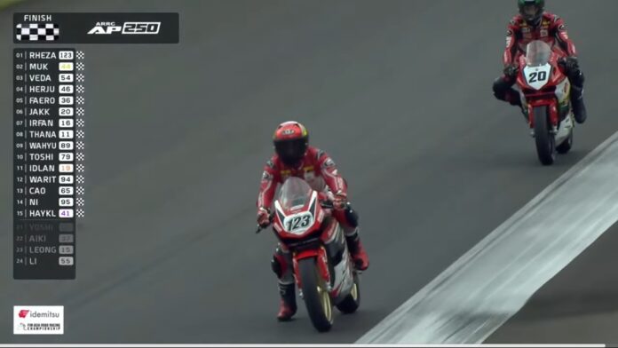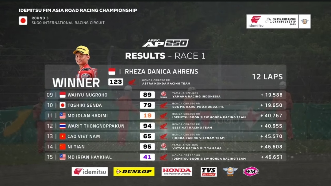 OtomotifZone.com-Jepang. Seri 4 ARRC Asia Road Racing Championship kembali Rheza Danica Arhens keluar sebagai juara pada kelas AP250cc sirkuit Sugo, Jepang di Race pertama Sabtu 24 Juni 2023. Meski start dari grid kedua dan tidak langsung memimpin balap namun terlihat pembalap asal Sleman, Jogjakarta ini lakukan race dengan rapi.