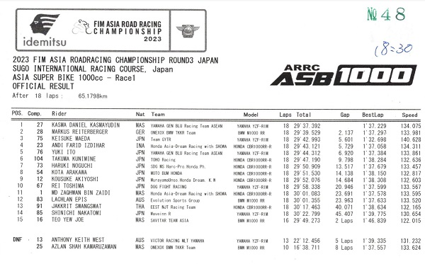 OtomotifZone.com-Jepang. Cuaca ketika race ini berlangsung dalam kondisi trek masih basah meski hujan tak selebat kelas SS600cc. ASB1000 ARRC Asia Road Racing Championship sirkuit Sugo, Jepang 24 Juni 2023 betul-betul seperti sudah di pastikan siapa pemenangnya ketika perjalanan balap sudah 60%.