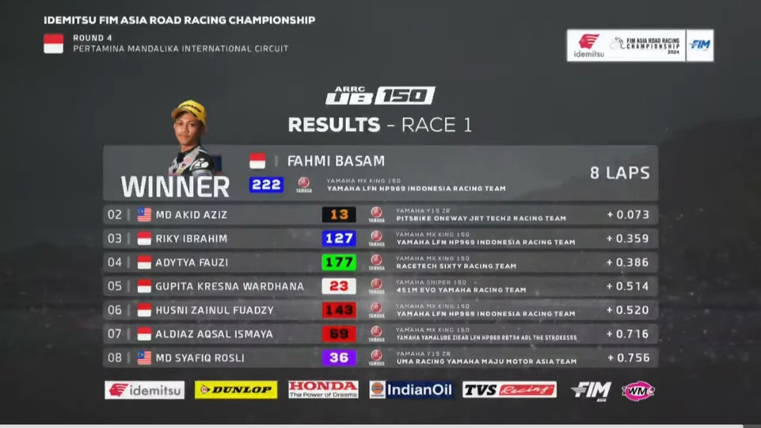 Insiden tabrakan sudah seperti hal yang wajar dalam perebutan posisi lap terakhir. Kali ini sama seperti seri Motegi, juara terlihat seperti biasanya masih abu-abu karena penentuan tetap street di garis finish. Dan tanpa diduga sosok lokal Fahmi Basam bisa memposisikan dirinya sebagai pembalap yang finish paling depan lewat adu kencang melawan Akid Azis kemenangan Tim H. LFN H. Putra sebelumnya mengalami trouble di lap awal. “Betul sedikit alami trouble dan baru bisa merasakan mesin yang cukup baik di akhir lap. Dan saya pun menuju garis finish Alhamdulillah bisa menjadi juara. Terima kasih tim dan bos Putra,” ucap Fahmi Basam.