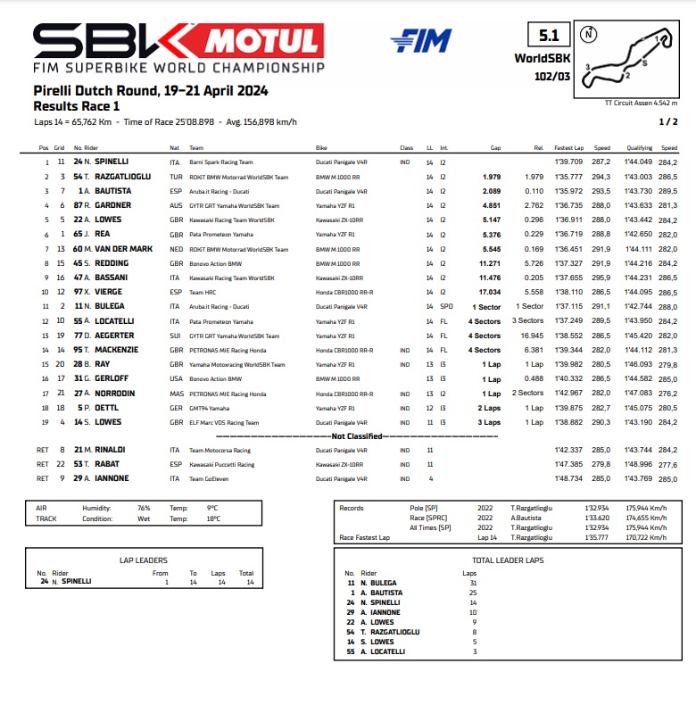 Waktu semakin genting ketika Toprak Razgatlioglu dan Alvaro Bautista makin menajamkan gap. Tapi apa yang terjadi?? Ada Red Flag!!! Motor Andrea Locatelli mengeluarkan asap dan oli. Nicholas Spinelli berhasil juara sebagai pembalap pengganti.