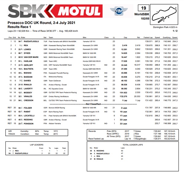 OtomotifZone.com-Inggris. Race 1 World Superbike putaran ke empat di sirkuit Donington Park 3 Juli 2021 baru saja selesai mencatat nama Toprak Razgatlioglu sebagai juaranya. Kemenangan ini pun di raih dari grid 13 hasil Superpole sebelum race.