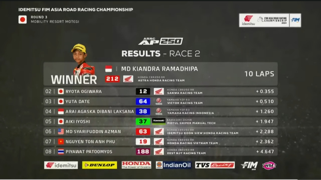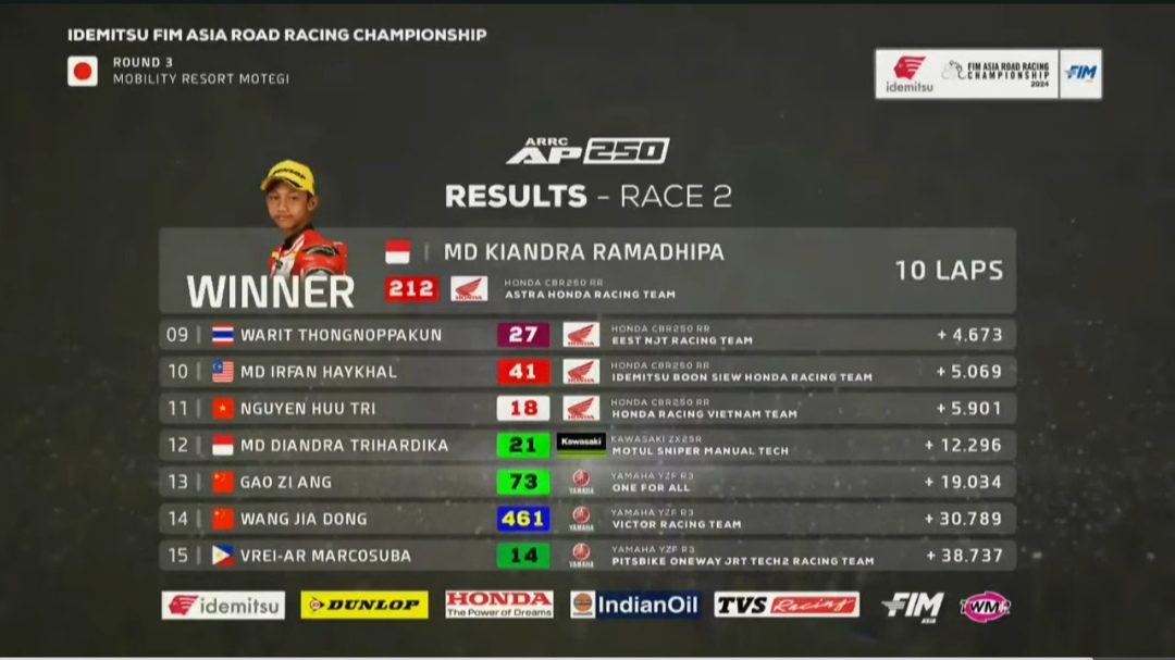 “Alhamdulillah bisa juara untuk kedua kalinya. Saya hanya berdo’a dan sabar di lap awal. Dan akhirnya strategi saya berhasil push di lap akhir bisa sampai juara,” ucap Rama. Selamat buat Rama dan team Astra Honda Racing Team. Dua kali juara di depan pembalap tuan rumah.