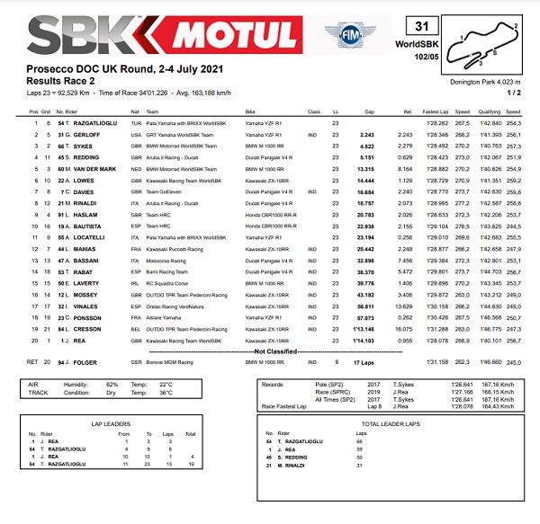 Toprak tak ada perlawanan di 13 lap tersisa dan berhasil menjadi jawara untuk race 2. Kemenangan ketiga di musim ini untuk Toprak dan membuat posisi klasemen sementara berubah. Kini dia sebagai pemimpin. Berikut hasil race 2 WSBK Donington Park.