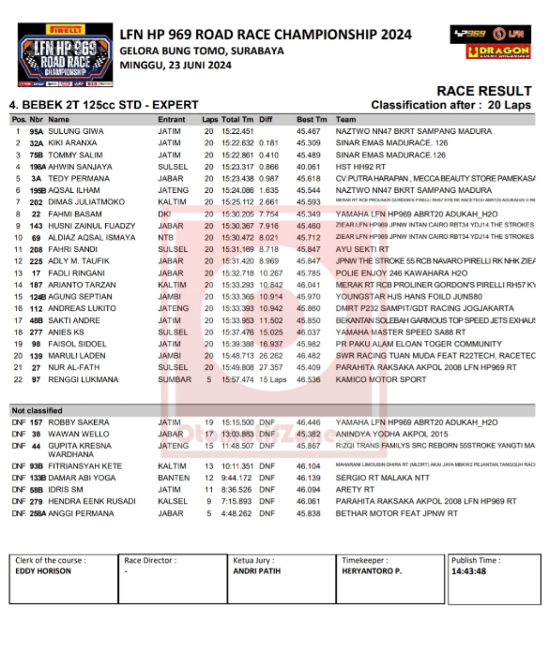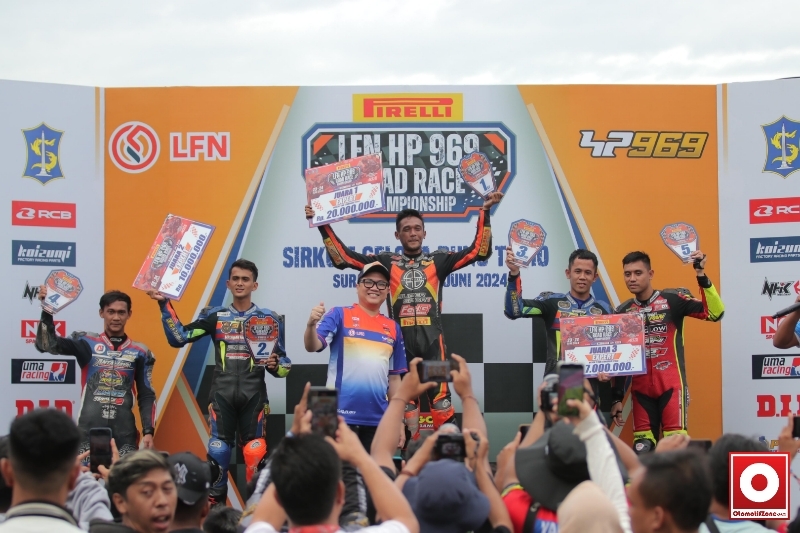 OtomotifZone.com – Surabaya. Sulung Giwa, pembalap asal Tulungagung yang tergabung dengan tim Naztwo NN47 Sampang Madura dan backup oleh bengkel BKRT Ponorogo, meraih kemenangan dramatis di kelas Bebek 2T STD 125cc Expert pada ajang LFN HP 969 Road Race Championship yang berlangsung di Sirkuit GBT Surabaya 24 Juni 2024. Kemenangan ini diraih setelah serangkaian insiden yang mengguncang balapan di lap-lap terakhir.